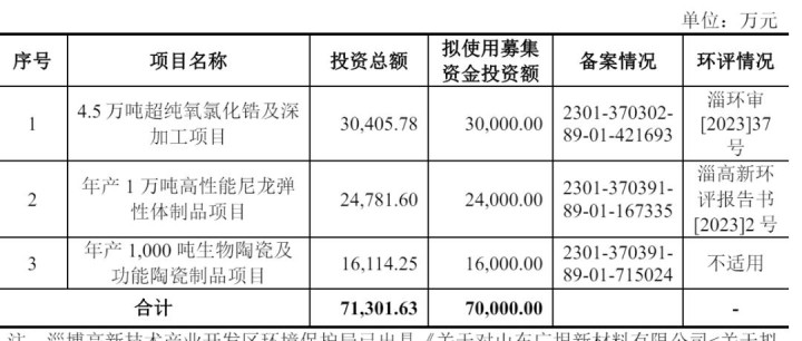 长裕集团计划募资7亿元,其中,3亿元用于4.5万吨超纯氧氯化锆及深加工项目,2.48亿元用于年产1万吨高性能尼龙弹性体制品项目,1.6亿元用于年产1000吨生物陶瓷及功能陶瓷制品项目。