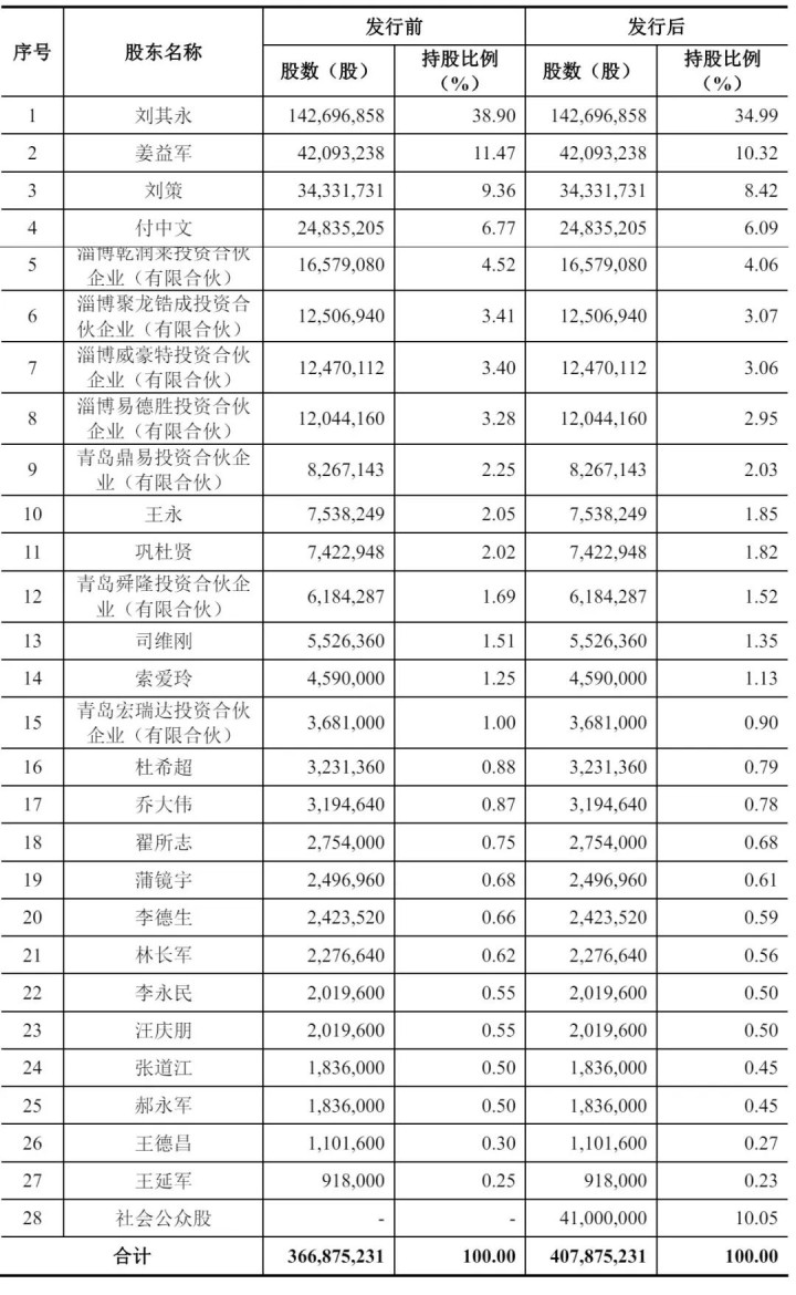 IPO后,刘其永直接持股为34.99%,姜益军持股为10.32%,刘策持股为8.42%,付中文持股为6.09%,淄博乾润莱投资合伙企业(有限合伙)持股为4.06%,淄博聚龙锆成投资合伙企业(有限合伙)持股为3.07%,淄博威豪特投资合伙企业(有限合伙)持股为3.06%,淄博易德胜投资合伙企业(有限合伙)持股为2.95%,青岛鼎易投资合伙企业(有限合伙)持股为2.03%;